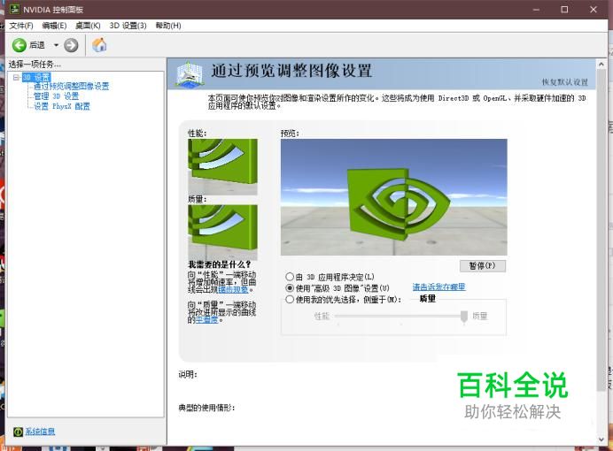 nvidia控制面板主要是对3D进行设置,比如第一个“通过预览调整图像设置”主要是对使用硬件加速3D的程序进行设置,主要是对系统性能和质量进行侧重选择。