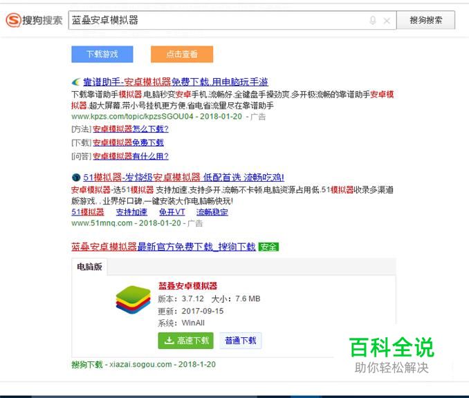 首先搜狗搜索 蓝叠安卓模拟器 点击下载安装