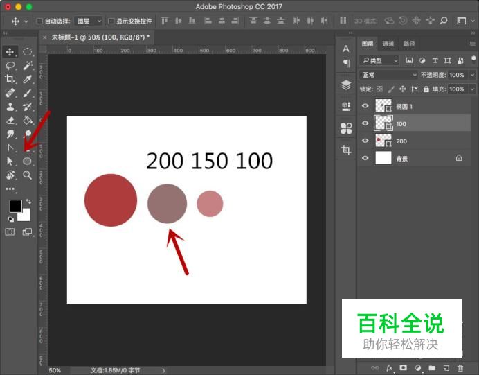 进入PS界面,选择“椭圆工具”,然后在画布中绘制大小分别为200,150,100的椭圆,更换颜色以便区分。