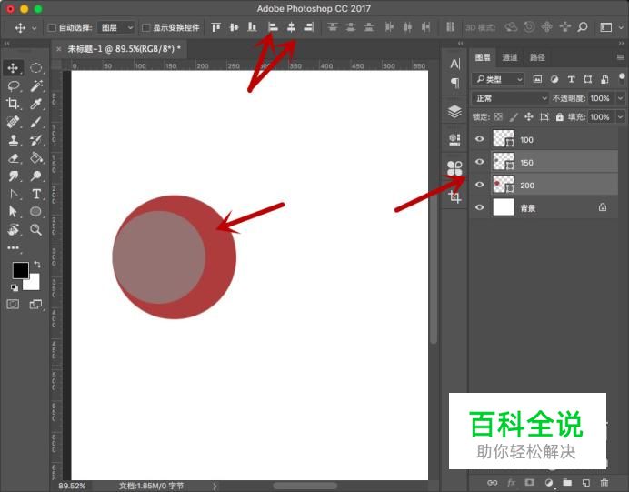 首先来处理200和150尺寸的圆,将2个圆放在一起,然后选择“左对齐和居中对齐”,将150尺寸放在200尺寸上。