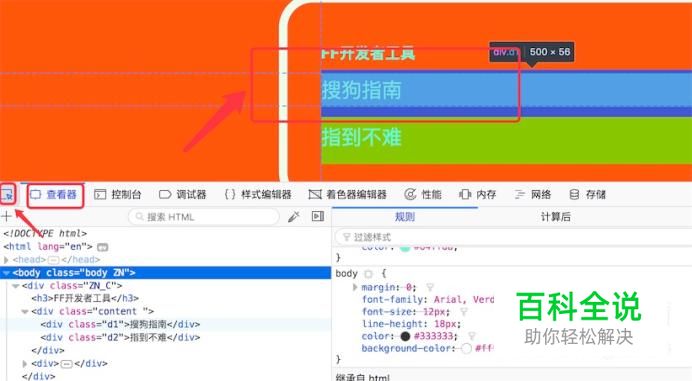 比如选中了‘搜狗指南'这段文字后,在开发者工具里,就显示出了对应的html代码了,在右边还显示出了对应div的样式内容