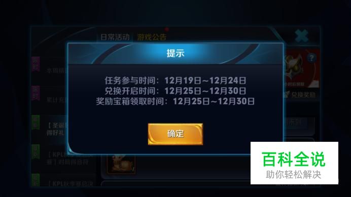 任务参与时间:2017年19日-12月24日 兑换开启时间:12月25日-12月30日 奖励宝箱领取时间:12月25日-12月30日 请各位玩王者荣耀的小伙伴们,记住以上时间,切记!切记!