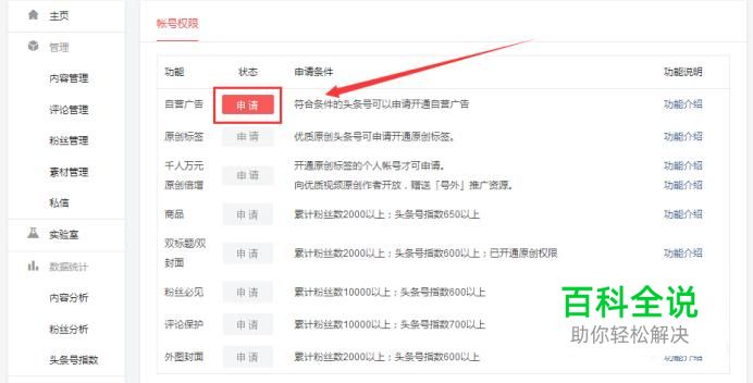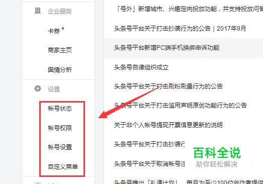 打开并登陆头条帐号,登陆成功后拉动垂直滚动条向下,在左侧找到有一栏:设置,下方有:帐号状态、帐号权限、帐号设置、自定义菜单 四个选项按钮。