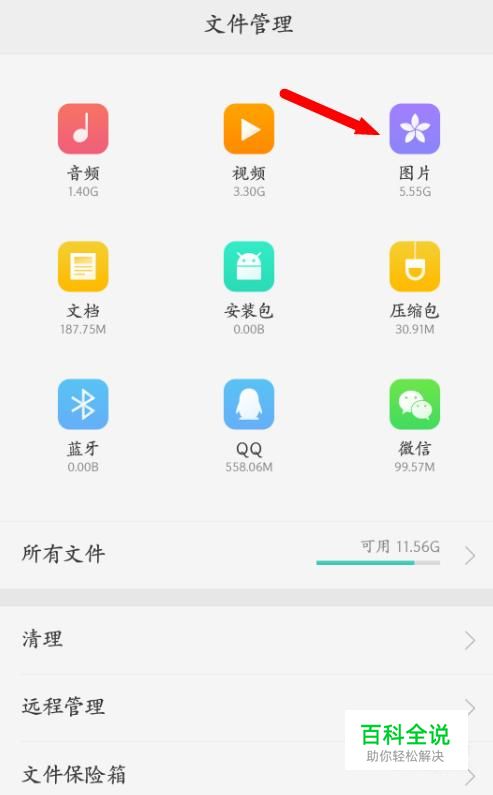 进入“文件管理”后,点击如图箭头所指的“图片”,点击进入。