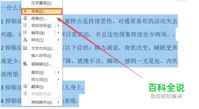 单击鼠标右键,在弹出来的选项卡中点击“字体”,如图所示。