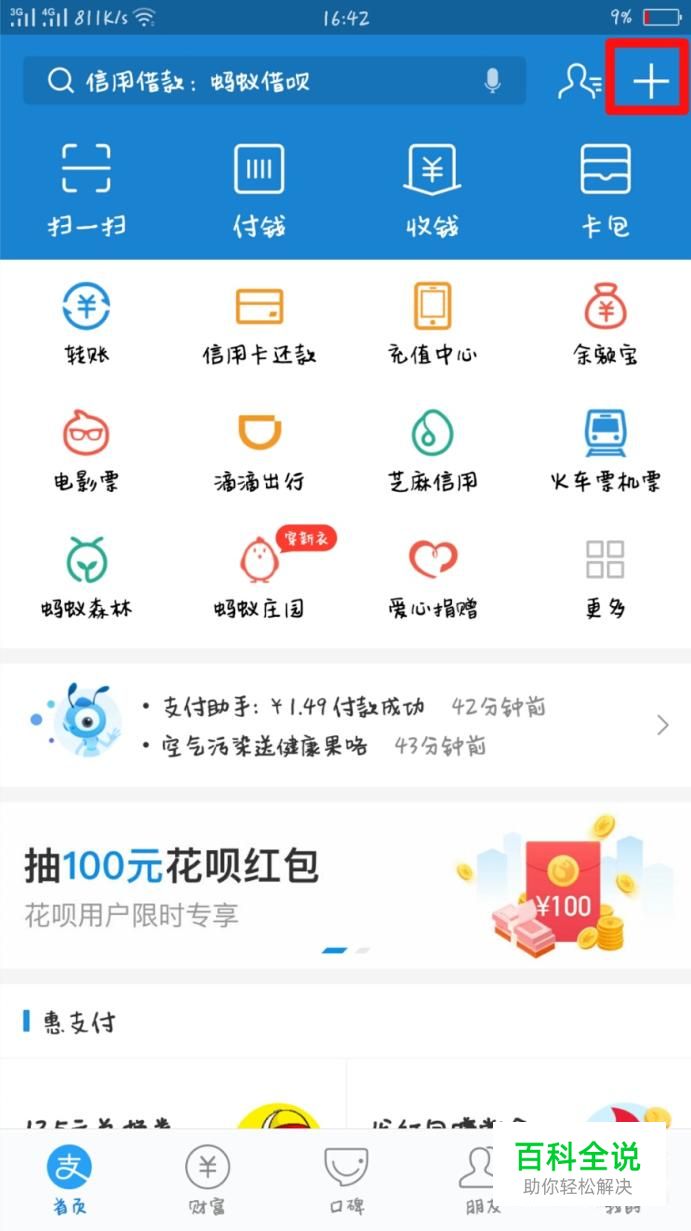 进入支付宝,点击右上角的“+”符号。