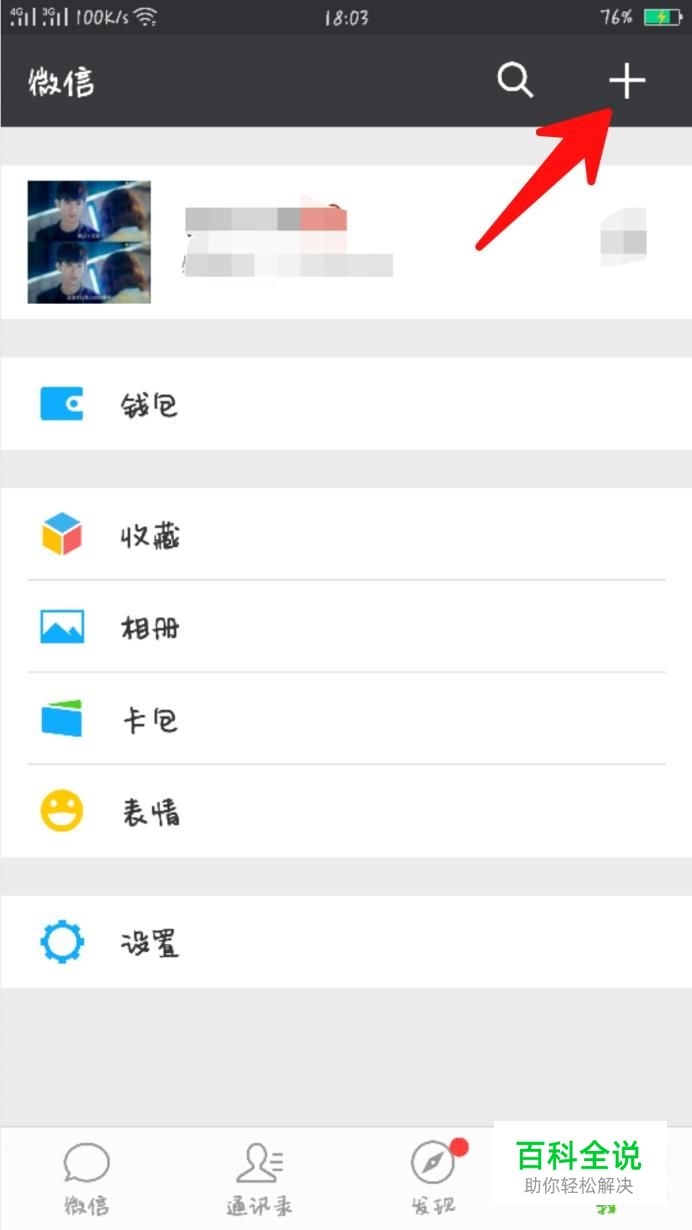 再来看看微信怎么扫手机里面的二维码吧!其实方法和支付宝的差不多哦。 首先点击右上角“+”符号。