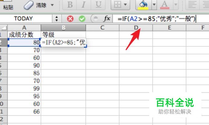 先点击选中B2单元格,然后在上方的公式里输入公式: =IF(A2>=85;"优秀";"一般" , 我们这里分二个等级,大于等于85分的为优秀,其他的为‘一般’