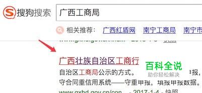 打开搜狗搜索,输入:广西工商局,搜索到结果后,点击打开。 (大家可以以自己当地名称来搜索)
