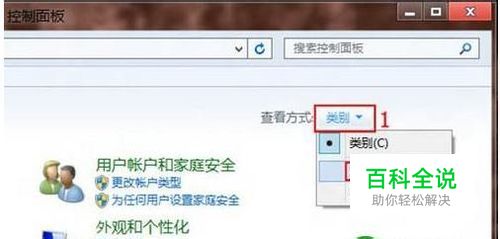 在弹出的控制面板窗口的右侧,点击查看方式“类别”下拉箭头,在菜单中选择“大图标(L)”。