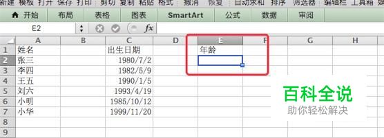 打开excel, 输入测试数据,姓名和出生日期列有明确的数据,年龄列等待计算。