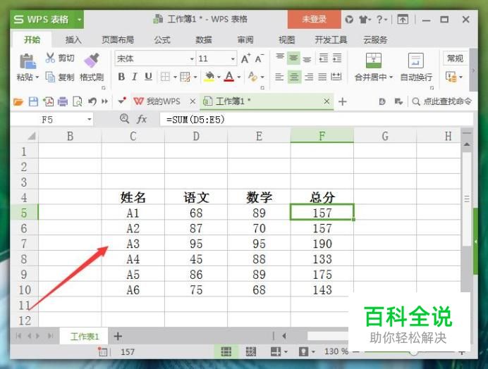 进入主界面后,制作一个表格文件。我们的目的是将总分按照从高到底进行降序排列,对于总分相同的,则按照语文成绩分数高的排在前面。首先选中表格中任一单元格,如图所示: