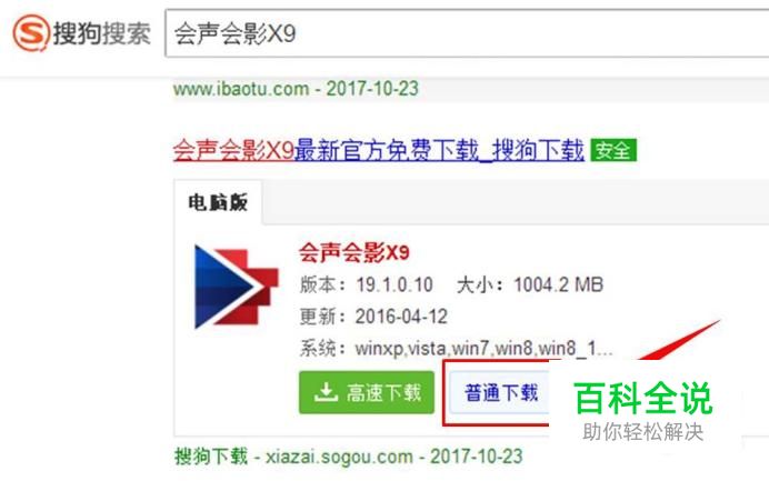 下载会声会影X9 在搜狗搜索中输入“会声会影X9”,在搜索结果中点击【普通下载】,下载完成后按照提示,完成软件的安装。(若事先已安装了该软件,请忽略此步骤)