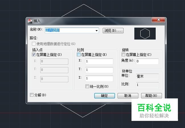 在弹出的对话框中为我们创建的块命名,这里我们给我们创建的块命名为“正六边形”。