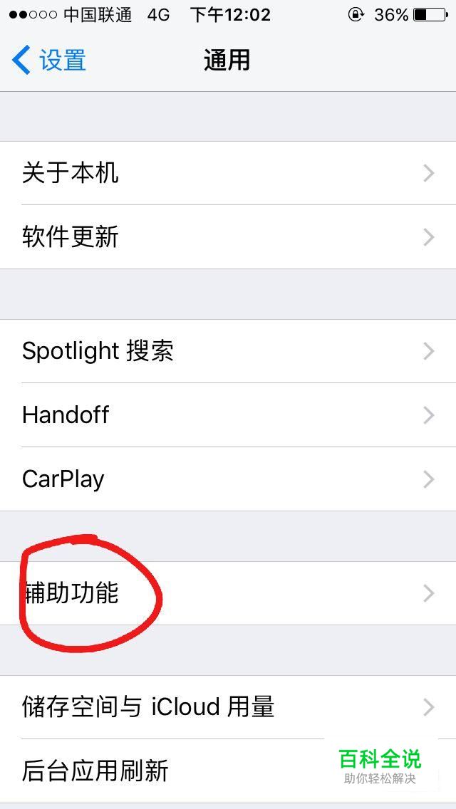 找到通用设置选项,点击进入,找到辅助功能并点击