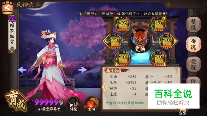 再来看看樱花妖的技能,普通攻击无特点,被动技能是加血技能,当友方式神行动的时候包括樱花妖自己,都有概率恢复樱花妖生命上限8%的血量,技能升级概率和比例都会增加。第三技能是攻击敌方全体式神,驱散所有的增益效果而且让接下来两个回合里对方的治疗效果下降,还有概率使对方式神进入睡眠状态,樱花妖是奶妈中最适合斗技的式神。