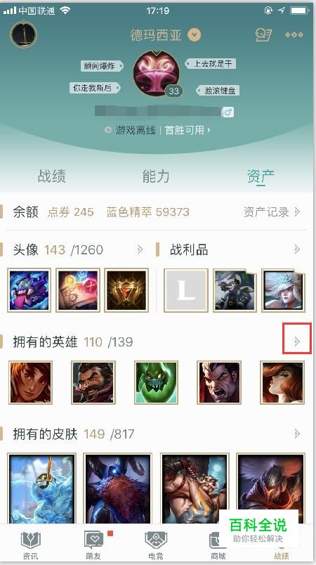 来到个人资料页后,点击英雄后面的那个小箭头,下图中标注出来的那个。