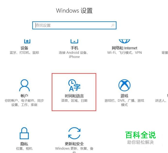 打开Win10系统设置页面,点击选择“时间和语言”设置菜单。