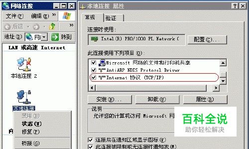 在弹出的“网络连接”窗口中右键点击可用的“本地连接”---属性,弹出“本地连接 属性”窗口,同时将“本地连接 属性”窗口滚动条拉到最下端,查看到“Internet 协议 (TCP/IP)”: