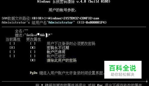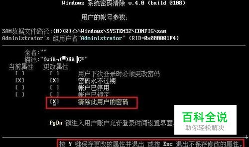 6、进入用户帐号参数界面后,将光标移动到“清除此用户的密码”选项并按“y”键保存更改并退出工具,如下图所示:
