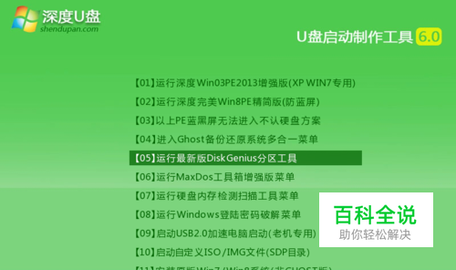 1、将准备好的深度启动u盘插入电脑usb接口,重启电脑,待出现开机画面后按快捷键进入到深度主菜单页面,选择“【05】运行最新版DiskGenius分区工具”,按回车键确认,如下图所示: