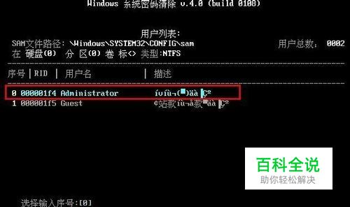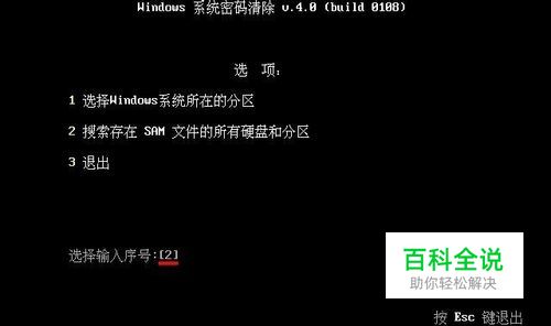 3、接着在选项界面中输入序号“2”,搜索存在Sam文件的所有硬盘和分区,按回车键确认,如下图所示: