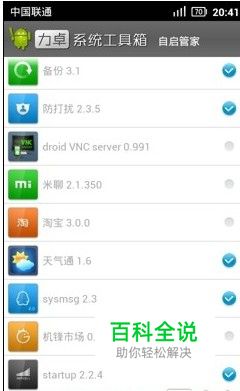 用这款软件来管理手机里的应用 然后打开,取得ROOT权限,点击主界面上的"自启管家"按钮,这时,程序会切换到另一个并加载了一个多选列表,如下面的提示所示,这些都是开机自启的程序. 这里大家要注意一下,虽说全部程序都能在这里手动取消自启,但是大家千万不要禁止系统自带的程序自启,不然出现什么问题我可不负责的哦. 把列表拉到最下面,我们可以看到,都是一些我们自己安装的第三方程序,如QQ.淘宝.什么的. 这些强烈建议大家取消掉. 设置完开机自启,我们就切换到"网络链接自启",这里也是跟上面的一样,系统自带的不要取消,自己安装的第三方软件可以随意取消.