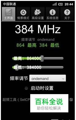 通过给CPU降频来省电,在需要极度省电的时候是个好办法 864M只适合日常的使用,如UC.QQ. 如果大家要玩游戏.建议调到1026M甚至更高(根据游戏大小调节) 如果大家要看电影.建议调到918M甚至更高(根据电影分辨率和码率调节) 下面的最低频率不用调节,也可以调大一点,但是不要比最高频率高. 如果最低频率和最高频率调节到一样,即是传说中的锁频