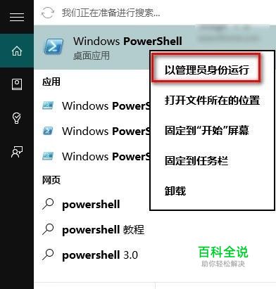 点击任务栏的搜索(Cortana小娜)图标,输入Powershell,在搜索结果中右键单击Powershell,选择“以管理员身份运行”
