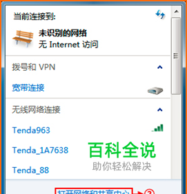 点击桌面右下角的网络图标,打开“网络和共享中心”