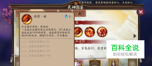 普通攻击,风符·破。一目连打出蕴含风之力的符咒对1名敌人造成攻击力100%伤害,造成伤害时吸收目标20%的攻击,持续2回合,不可叠加。技能升级增加伤害5%。普通攻击自带减对手攻击,加自身攻击的特效,没有太大亮点,并且一目连的另外两个技能都是随着生命值的升高而加强的,普攻的话就略鸡肋了,没有鬼火发动技能时可以普攻对方输出式神。