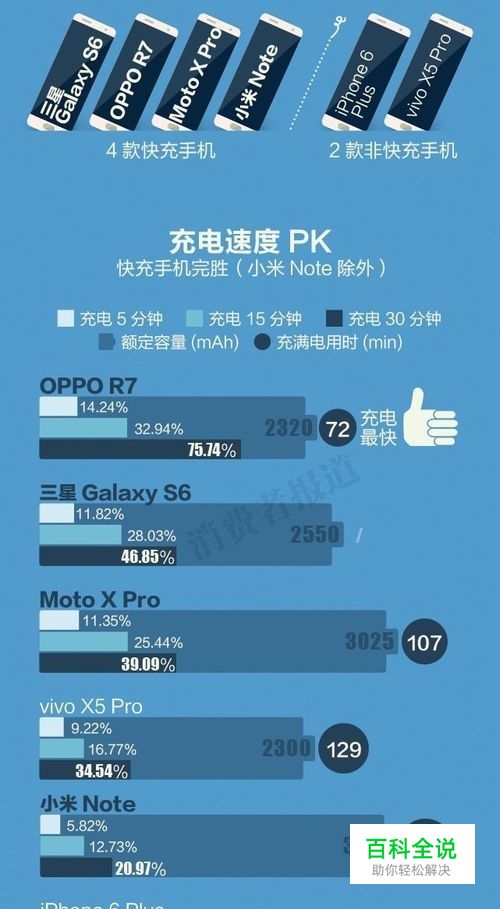 首先,说明一下“充电5分钟通话2小时”是否可以实现!(数据来自于消费者报) 拿OPPO R7举例,通过消费者报(图1)的数据可以看出,OPPO R7充电5分钟,电量达到了14.24%,通过(图2)数据可以看出,OPPO R7半个小时耗电量为3%,两个小时为12%,所以充电5分钟是可以支持通话2小时的。还有一个实测举例。(测试的结果与手机购买时间长短、手机后台运行程序数量有关。)最后两张为亲测图,10分钟充电为26%, 因后台跑着秒表和一些其他程序,影响了充电速度,如果关闭的话,速度应该会更快。 结论:通过上面的测试结果表面 ,充电5分钟通话2小时是可以实现的。