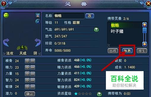 灵兽出站时,打开灵兽面板,点击右上边的休息,即可让灵兽离开战斗。