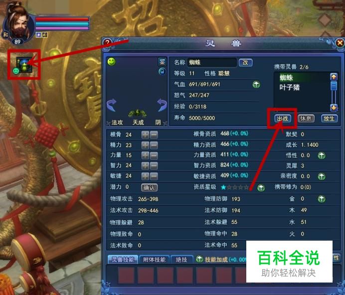 当拥有灵兽时,点击左上角灵兽头像或打开灵兽面板,选择需要出战的灵兽,点击右上边的出战,即可让灵兽参加战斗。