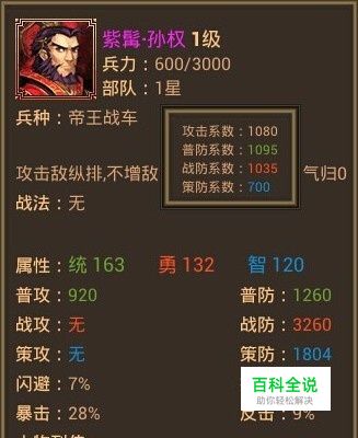 属性:统163勇132智120 攻击系数: 1080 普防系数: 1095 战防系数: 1035 策防系数: 700 闪避: 5% 抵抗: 5% 暴击: 25% 反击: 9% 文字都是浮云,开打才是王道,这次与紫髯·孙权一较高下的2位武将是诡·司马懿和磐·姜维