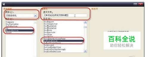 利用Word域功能,我们可以轻松地制作带提示的模板。还是以添加标题为例。 将鼠标定位于准备添加提示的位置,点击功能区“插入”选项卡“文本”功能组“文档部件”按钮,在弹出的菜单中点击“域”命令,打开“域”对话框。在左上方的“类别”下拉列表中选择“文档自动化”,然后在下方的列表中选择“MacroButton”,在右侧的“宏名”列表中选择 “DoFieldClick”,并在其上方的“显示文字”输入框中输入提示文字“〖单击此处添加文档标题〗”,如图1所示。确定后保存模板,那么用此模板新建的文件中就会在标题处显示提示“〖单击此处添加文档标题〗”,单击它即可选中。