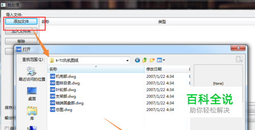 “批处理”按钮点击之后,在软件界面中会出现一个“批处理”的窗口,在这窗口中点击“添加文件”添加需要转换版本的DWG文件。