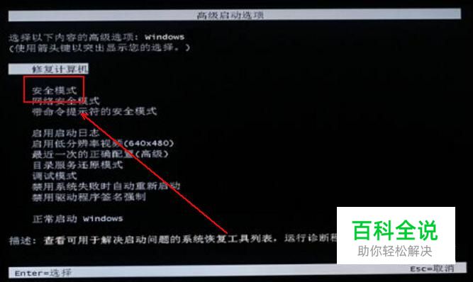 开机时按F8进入“高级启动选项”并选中安全模式。
