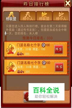 《大掌门》全新“盟战”玩法将于9月19日震撼开启。届时玩家将一睹“群侠决战紫禁之巅”的独特魅力。对于此“盟战”新玩法,众多玩家接触时还存在些不解和疑惑。下面就将为广大玩家详细介绍此玩法的操作攻略。相信看过此攻略后,玩家们参与“盟战”将得心应手。 一、报名阶段: (一)报名要求: 联盟等级达到2级。至少同期有三个联盟有成员报名 (二)报名时间: 每周一0:00---- 周一 20:00 (三)天榜地榜: 1.天榜 等级大于26级的玩家自动争夺天榜,凡进入紫禁之巅的天榜联盟皆可获得圣上嘉奖,联盟内成员各100元宝。 2.地榜 等级小于等于25级的玩家自动争夺地榜,凡进入紫禁之巅的地榜榜联盟同样获得圣上嘉奖,联盟内成员各50元宝。 3.联盟排名 根据决战巅峰战斗战败顺寻排出天榜联盟排名及地榜联盟排名。根据排名分别给予联盟一定数量的紫禁宝匣。 4.个人排名 根据个人连胜次数排出天榜个人排名及地榜个人排名。根据个人排名分别给予一定数量的银两、玄蛇胆(增加功力道具)、武器精炼材料等道具。 注:争夺不同榜单的玩家之间不会互相遭遇战斗。同联盟的玩家之间不会互相遭遇战斗 二、决战前夕: (一)参与方式: 1.第一次抉择: 参与时间:每周一 20:00 -- 周一 21:00 在第一次进行选择时掌门可以选择从以下四处任意一处出发,每处可为掌门增加不同属性,并且选择不同道路的掌门之间不会互相遭遇。 蜀道:攻击10%,暴击值300 白帝城:防御10%,降低临死一击伤害10% 乐山:血量10%,额外恢复300~800血 剑阁:内力10%,技能释放概率5% 2.第二次抉择: 参与时间:每周一 21:15 -- 周一21:30 成功通过第一处的玩家可以再次进行选择,选择以下四处之一继续向紫禁城进发: 云州:攻击10%,暴击值300 河东:防御10%,降低临死一击伤害10% 敦煌:血量10%,额外恢复300~800血 玉门关:内力10%,技能释放概率5% 3.遭遇战斗 在向紫禁之巅行进中会随机遭遇敌人,战斗胜利后有机会获得天榜(地榜)宝箱,培养丹,银两。开启宝箱将有几率获得至尊武学《九阴真经》。 三、巅峰赌局: (一)押注时间 周一22:15 ---- 周二 14:00开设巅峰赌局 (二)押注玩法 所有加入联盟的玩家皆可以在此选择自己认为可以获胜的联盟,并且在10W银两,100W银两,1000W银两中任选一种进行押注,获胜各可获得20培养丹,50培养丹,150培养丹,若失败则损失掉所压银两。 四、决战巅峰: (一)增加BUFF 进入决战的玩家可在周二 14:00 -- 周二 20:00进行增加BUFF。 各位掌门所在联盟在决战前夕每战败一位玩家便可为自己选择一定数量的BUFF加成,战败玩家越多,可选BUFF加成越高。 加成BUFF之后等待决战开始 (二)决战时间 周二21点-----周二23点 (三)搏命一击 当掌门遇到较强对手,战败时所有弟子将会一齐发动搏命一击,对敌人造成大量伤害。受到搏命一击的掌门弟子即使所剩血量极低也可保证拥有至少一滴血,保证不与对方同归于尽。 (四)观战 在决战巅峰时间所有玩家皆可在活动界面进行观战,观看当前进行战斗的队伍。 五、天下第一盟 当天榜战场仅剩某一联盟玩家时,决战巅峰结束,最终胜利联盟为天下第一盟。并联盟所有成员获得天下第一盟的称号,增加50气势。 六、武林盟主 (一)争选盟主: 战斗结束后天下第一盟的盟主,即为武林盟主,受万人敬仰。并获得武林盟主限时称号增加100气势。 (二)参见武林盟主: 决战结束后每日可在活动页面进行参拜武林盟主,26级以上掌门获得掌门威望、银两、元宝奖励,26级以下可获得银两奖励。 七、独步江湖 根据连胜次数,天榜连胜次数最多的玩家可获得限时称号”独步江湖“增加100气势。