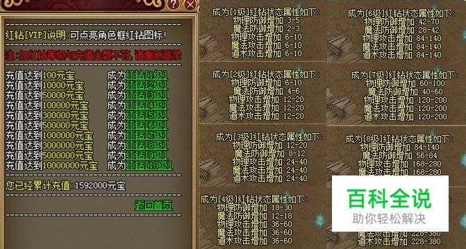 红钻等级也是武尊里面一个比较常用的buff属性,而且很容易获得。充值就可以获得红钻等级,点亮图标并且获得buff,不同的等级会有不同的状态加成,达到多少的等级会在自己人物面板上显示。下面介绍一下武尊的红钻等级。 8090武尊的红钻等级分为10级,最低的1级只需要充值100元宝也就是1块钱就行了,最高的10级是10000000元宝,也就是10万人民币,这个只有土豪才能做到了。正常情况下,普通玩家到达红钻1-6级都是有可能的,这个根据各位玩家的充值需求以及经济情况决定。 红钻的作用主要有彰显身份,显示自己充值了很多,另外一个作用就是比较重要的了,成为红钻之后,可以领取属性状态,从一级少量增加防御攻击到10级的巨量增加,提升幅度还是非常大的,而且这个状态是常驻的,非常不错。 武尊的红钻就介绍到这里,红钻只是充值的一个附赠品,所以还是很不错的,有条件的玩家尽量多提高自己的红钻等级。