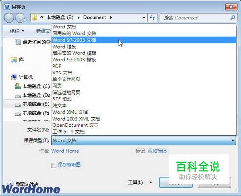 第2步,在打开的“另存为”对话框中,单击“保存类型”下拉三角按钮,在文件类型列表中选择“Word97-2003文档”选项。然后选择保存位置并输入文件名,最后单击“保存”按钮即可,如图2009121208所示。图2009121208 Word2010“另存为”对话框