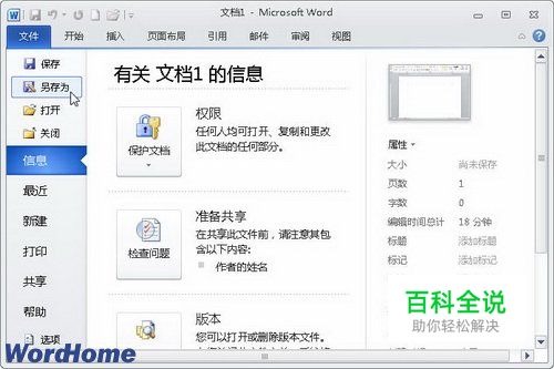 第1步,打开Word2010文档窗口,依次单击“文件”→“另存为”按钮,如图2009121207所示。图2009121207 单击“另存为”按钮