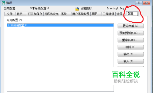 选择“工具”菜单里的“选项”打开“选项”对话框,点击“配置”选项。