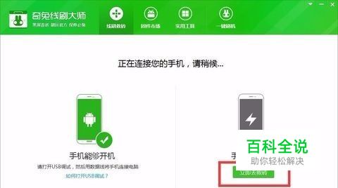 连接手机。[能开机的打开USB调试即可连接。如果不能开机,进入自己机型的线刷模式再连接电脑。](若电脑提示连接异常或不停闪跳,请检查驱动和数据线或端口问题)。