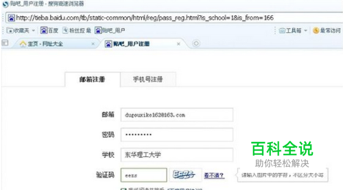 电脑注册:打开链接 http://tieba.baidu.com/tb/static-common/html/reg/pass_reg.html?is_school=1&is_from=166 进入网站,填写注册邮箱,登录密码,学校和验证码,如图,点击注册。