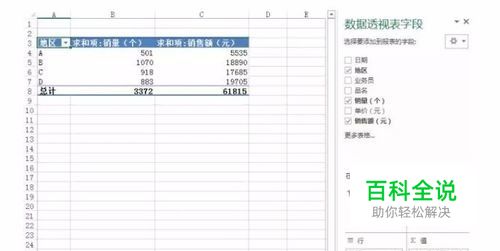 百分比计算 Q: 上半年,哪个区域的销售额最大? Step 1 将“地区”字段拖到行标签,“销量”和“销售额”字段拖到值汇总区域,汇总方式设置为求和。