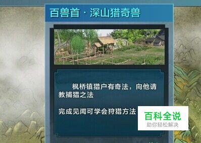 如果你之前没和狩猎过的话,那么第一次是要进行一个百兽首深山猎奇兽的见闻。小编的见闻是在江南那个码头弄的,很简单,一个对话就结束了。并且会赠送两个道具,一把弓箭和一个箭筒。