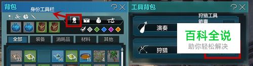 完成见闻之后,我们把道具装备到自己的身份工具栏里面。这里说下,必须要有工具,不然后面没办法进行。如果没有了狩猎工具,可以去杂货店购买。