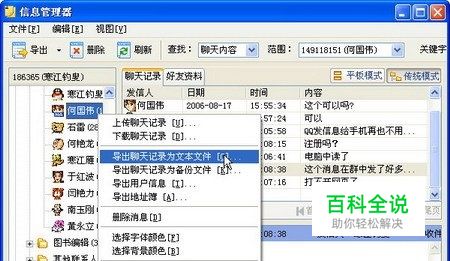第1步,打开“信息管理器”窗口,在左窗格中右键单击要导出聊天记录的好友名称,选择“导出聊天记录为文本文件”命令,如图2010040856所示。 图2010040856 导出聊天记录为文本文件