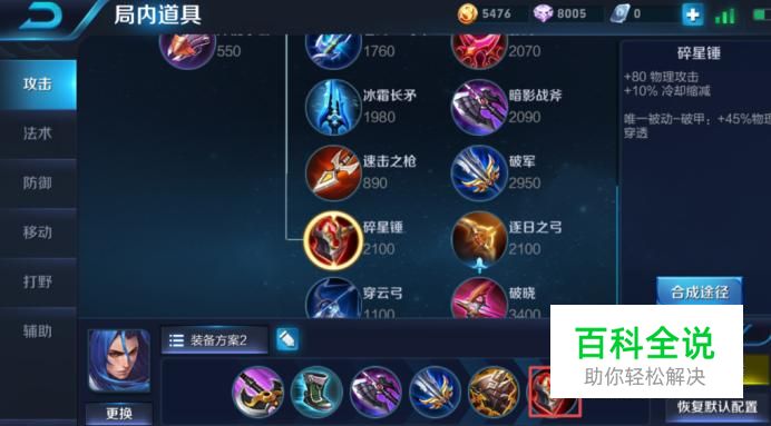 最后一件装备我们可以出碎星锤,这个装备是才出来没多久的,这个装备非常的有用,可以提高10%的冷缩缩放,这样橘右京的技能冷却时间就会缩短,效果是非常棒的。